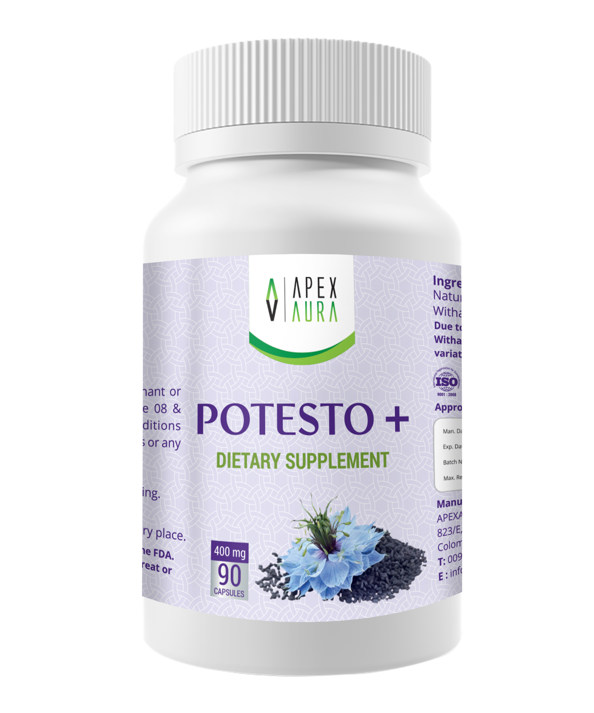 Combination of two natural herbals Withania somnifera root powder and Black cumin seeds powder. Apex Aura Potesto capsules with many health benefits, including, anti inflammation, helps to Lowers blood pressure and cholesterol , helps to Lowers blood sugar . It also helps to prevent asthma, protect liver and aid kidney function, boosts memory, energy and sexual health and many more health benefits. Black cumin seeds and Ashwadandha has used in traditional ayurweda medicine for years and as a natural herbs to enhance health and prevent illnesses.